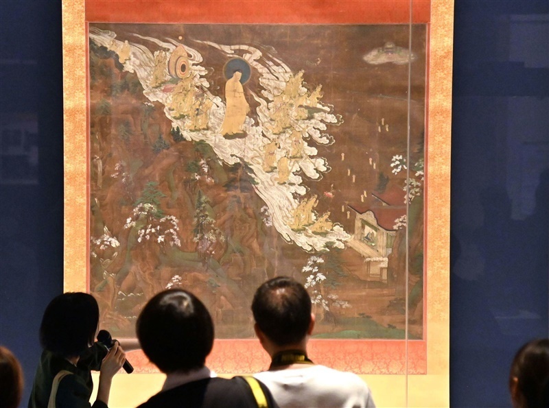 その善導の目に、人々を救いに現れた阿弥陀如来は見えていたのだろうか。知恩院蔵の「阿弥陀二十五菩薩(ぼさつ)来迎図(早来迎)」(展示は11月3日まで)は、左上から右下へ流れる阿弥陀如来の乗った雲がスピード感を感じさせる。