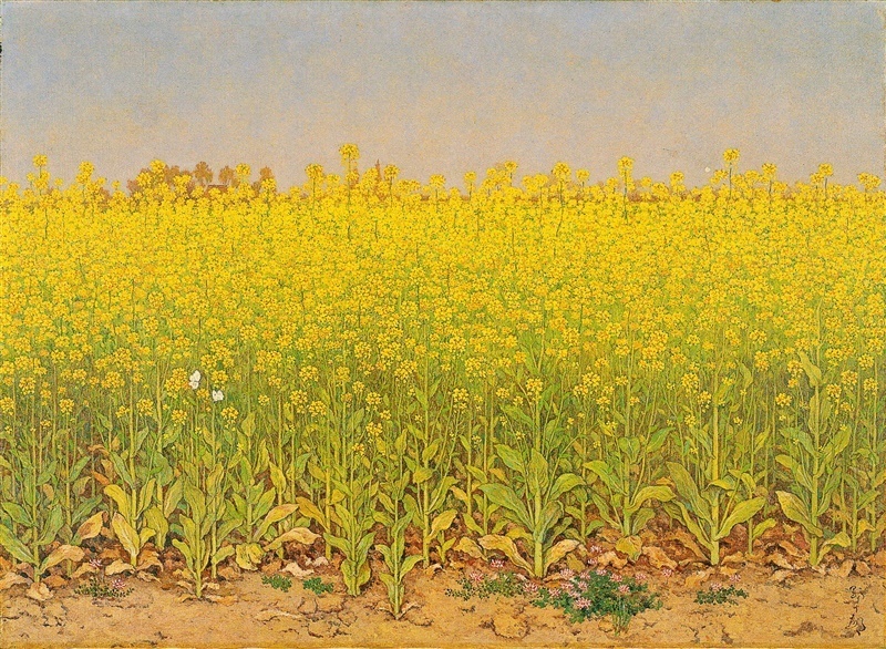 75歳の年の油彩「菜の花」は、写実的でありながら、この世の物でないような違和感を与える。全ての花がこちらを向き、茎や葉、土など隅々まで焦点が当たって精緻に描き込まれているからだろう。<花一つを、砂一粒を人間と同物に見る事、神と見る事>(遺稿ノート)。生涯、仏教に深い関心を寄せた野十郎は、絵筆を握ることで万物に等しく慈悲を注いだ。