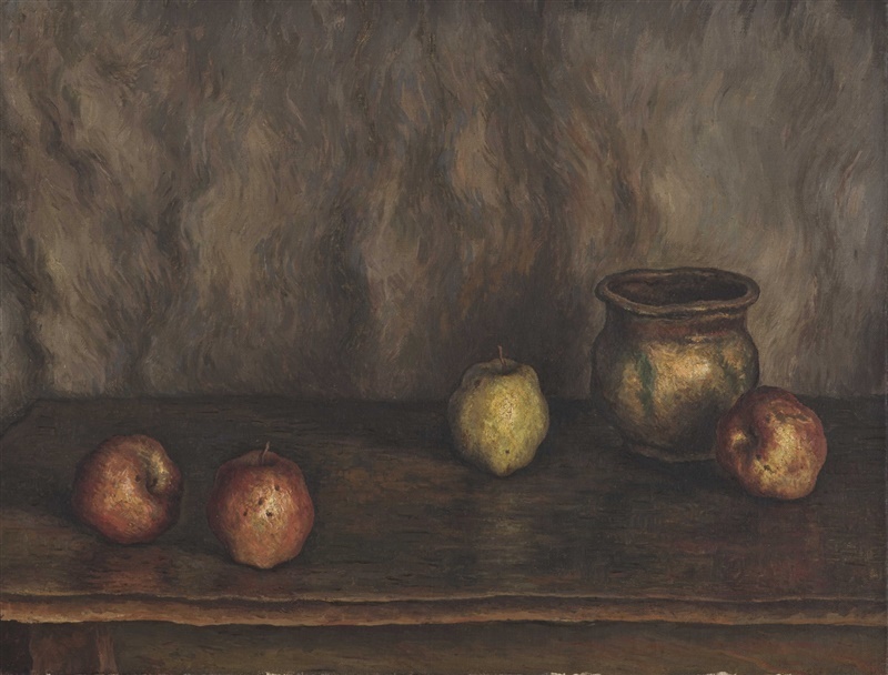 野十郎が10代で描いた「壺(つぼ)とりんご」は、ゴッホや岸田劉生(りゅうせい)の影響を色濃く感じさせる。劉生はリンゴなどの対象を細密に描くことによって、存在そのものの神秘性を探究した。野十郎は画壇に属さなかったとはいえ、写実を深く追求する哲学的姿勢を劉生から吸収したと言えよう。