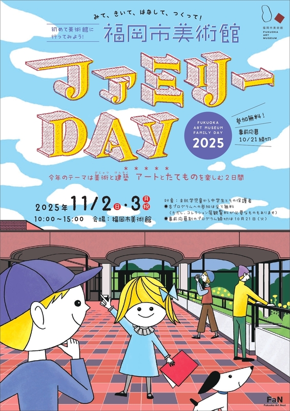 今年は当館を設計した前川國男の生誕120周年にちなんで、美術と建築をテーマに、展示室の中で作品・建物についてのクイズを解いたり、アーティストによるワークショップを開催したりなど、美術館をまるごと楽しむさまざまなプログラムを実施します。さらに、11月3日(月・祝)はコレクション展観覧料が無料になります。ぜひ、ご家族で福岡市美術館へいらしてください!