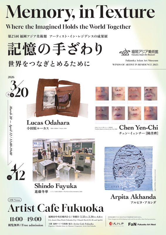 福岡アジア美術館では、いま注目のアーティストたちを国内外から招へいし、福岡での滞在制作や市民交流などを支援するアーティスト・イン・レジデンス事業をおこなっています。今年度の第2期(10~12月)と第3期(1~3月)には、4人のアーティストが参加しました。この度、その成果を発表する展覧会として、「記憶の手ざわり:世界をつなぎとめるために」展を開催します。
