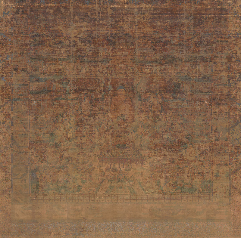 森實:後期の目玉は綴織當麻曼陀羅です。1200年以上前のタペストリーが残されていること自体がそもそも凄い事です。また『観無量寿経』というお経に説かれた極楽浄土の世界が忠実に織られていることが浄土宗の最も大切な寺宝(根本曼荼羅)とされる理由です。写真ではその真価がわからないと思いますが、会場で実物をご覧いただくと、その素晴らしさがわかると思います。こちらは奈良の當麻寺でも非公開の作品なので、この機会を逃すと見ることができないかもしれません。