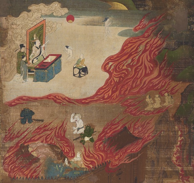 ちなみに地獄に落ちるか否かの審判の場面にも赤い丸が描かれています。これは地獄に落ちる直前で蓮台が迎えに来たものかと思われます。間一髪のところで日頃の行いが良かったことが閻魔様の調べで判明してお迎えにきたのか、最後の最後まで念仏を称えた結果、ギリギリで救済のお迎えが来たのかまでは不明です(笑)。