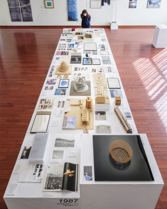 壁には図面や紹介パネル等の平面が並ぶ中、展示室の中央に大きなテーブルを置き、熊本県内のプロジェクトの模型やプロダクトデザイン等を、年代ごとにまとめて展示しています。