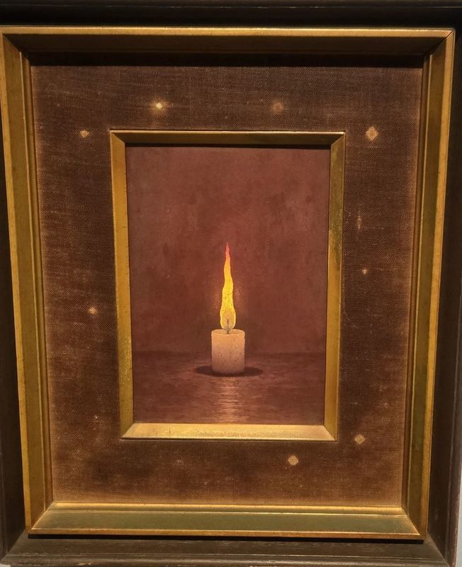 高島野十郎の代表作のひとつである≪蝋燭≫。台の上に火が灯っている蝋燭がたった1本立っている。言葉にすればたったそれだけの作品ですが、絵を見る人々は炎のゆらめきにいつまでも見入ってしまいます。