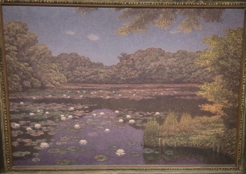 野十郎の現存する作品としては最大の大きさを誇る≪すいれんの池≫。取材場所は新宿御苑といわれています。対象のすみずみまで等しく愛情を込めて描かれた作品はリアルに写実されていながら白昼夢のような神秘的な雰囲気をたたえています。