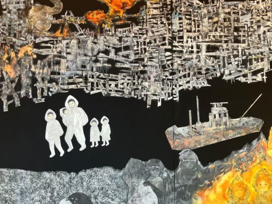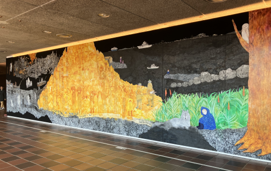 すべてを飲みこむような黒をバックに描かれる人々や自然の営み——可愛らしさと恐ろしさが共存する、静かな熱情を感じさせる13メートルの壁画。