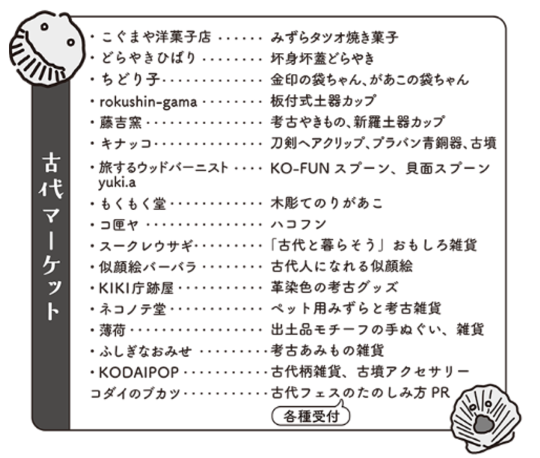 内容:古代マーケット、古代トーク(要事前申込)、キッチンカー、ちんどん鈴乃家さんのパフォーマンス