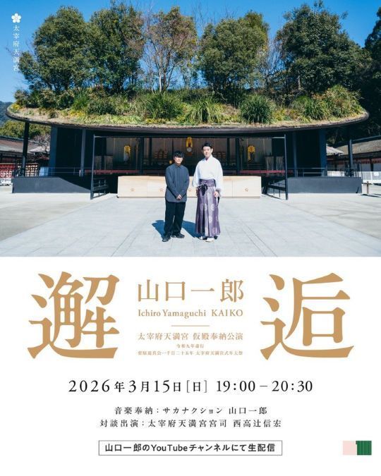 令和九年に斎行される「菅原道真公一千百二十五年 太宰府天満宮式年大祭」に関連する奉納企画として、3月15日(日)、太宰府天満宮 仮殿において、サカナクションの山口一郎氏による音楽奉納が行われることが発表されました。当日は、第40代宮司・西高辻信宏氏との対談も実施。