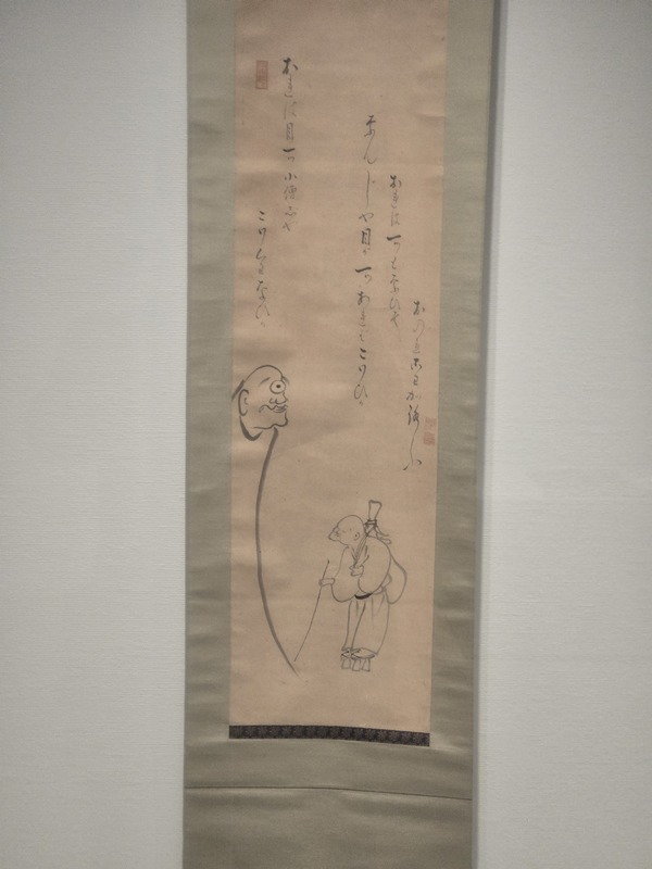 こちらは江戸時代に描かれた提洲禅恕による「目一つ小僧図」。中津市の自性寺に伝わるものですが、一つ目小僧が「自分のことが怖いだろう」と脅かすも、盲僧が「自分は1つも無いから自分の方が怖いだろう」と言い返す図です。ユーモラスな作品ですが、禅の教えや心眼をもって修行にあたる戒めなど深い思いが込められているそうです。